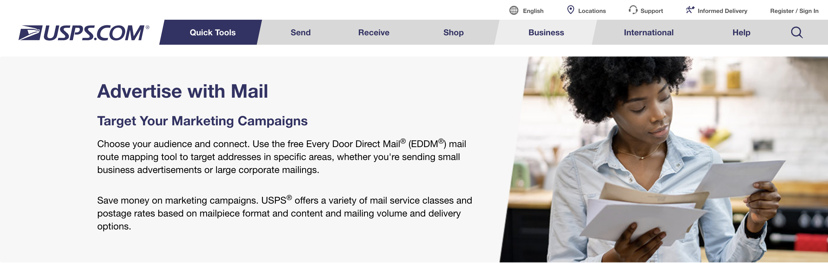 The USPS provides commercial marketing mail service, allowing businesses to send marketing materials such as printed matter, flyers, newsletters, catalogues, and so on. USPS Marketing Mail offers low-cost mailings of 200 or more pieces or 50 or more pounds of mail. If you're not sure if this is right for your company, pick one small location to test the market. Before broad distribution, you'd better do several tests with minor tweaks to determine the most successful mix of audience, offer, and design. The USPS's online mapping tool and Every Door Direct Mail delivery service make it simple and cost-effective to design and execute a mailing.