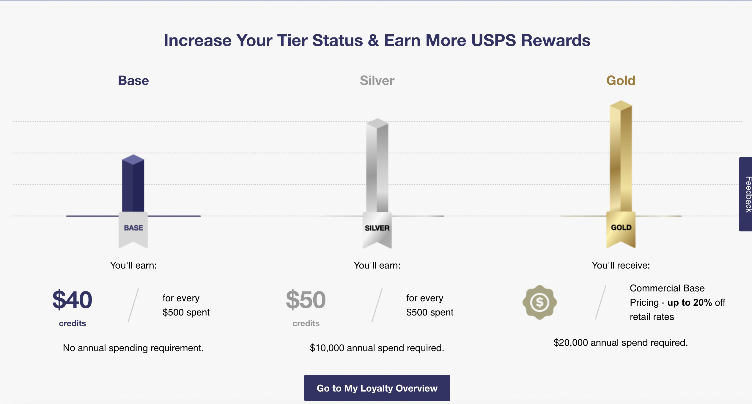 USPS has designed a well-developed rewards system, which comprises of multiple loyalty levels to assess and allocate to customer at the start of each calendar year, to promote small companies and encourage them to stick to this loyalty program. As their shipment volume increases, business users' benefits will increase under this framework. That is, the more they ship, the more money they save. Available credits are also displayed when you login to "My Loyalty Overview" from https://usps.com/loyalty