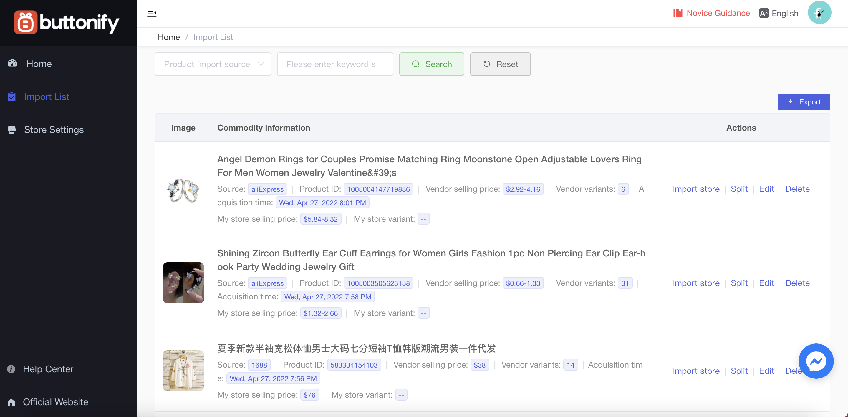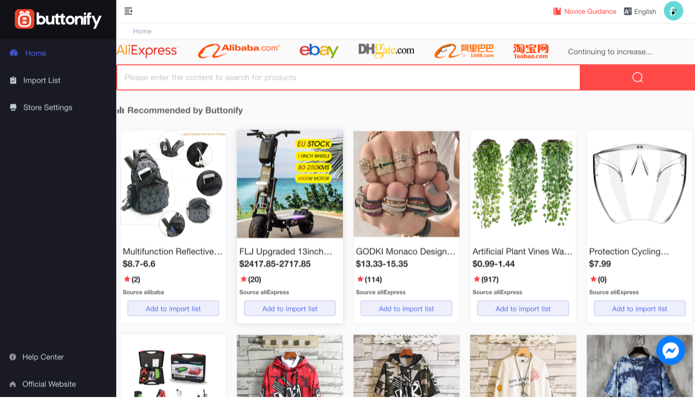 Browse products in Buttonify, where you will find a variety of apparel and accessories recommended by Buttonify. You can analyze data and import products from “Best selling” list. Most of these products are sourced from Alibaba and AliExpress, therefore you can find tons of less expensive items than anywhere else. If you don’t know what to sell as a beginner, you can start with the products recommended by the platform from the “Best selling” list.