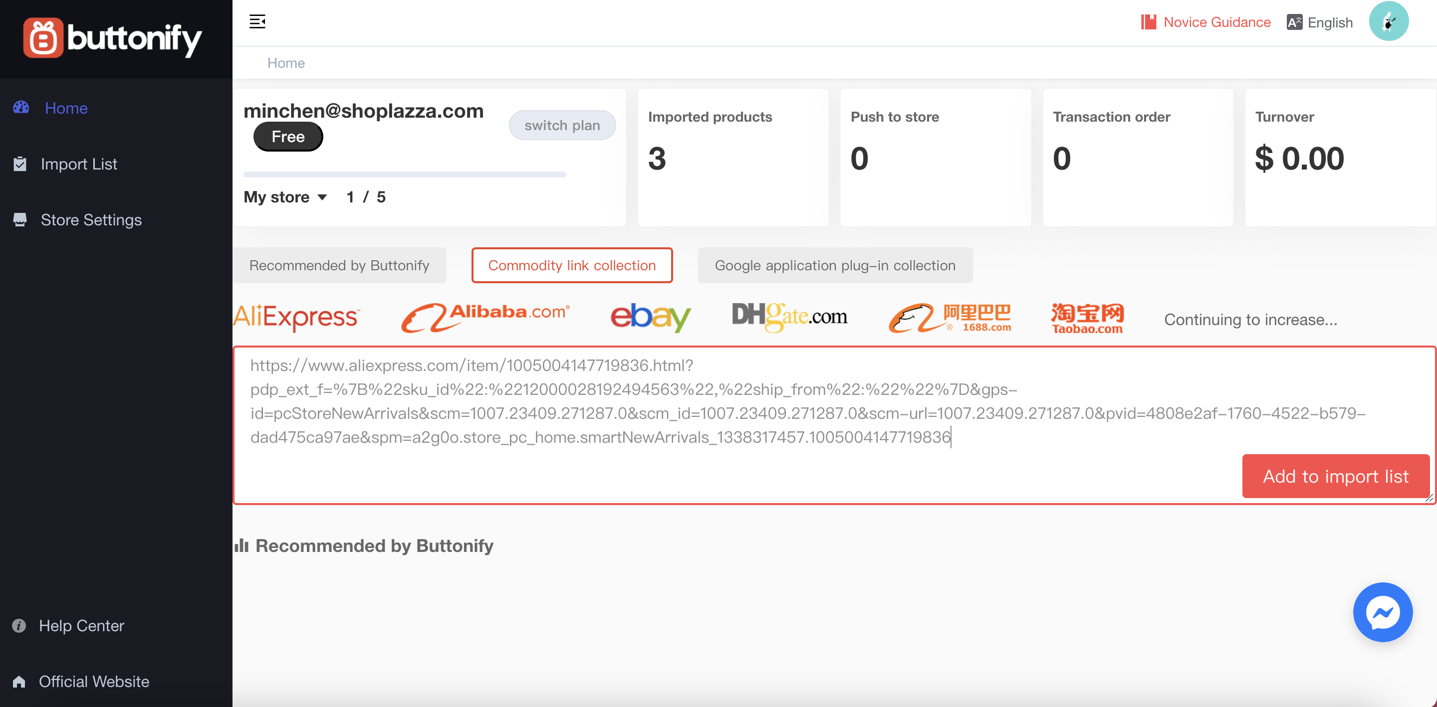 Put the product link from AliExpress or Amazon in the search box. The system will automatically add the product to the Import List. With this function, you will be able to easily add products to your online store, which save you a lot of time and labor.