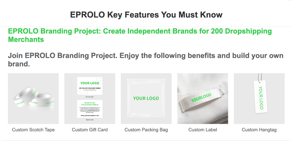 EPROLO also has a Branding Project that offers extra services to its members to help them grow their brand while dropshipping, such as custom tape, gift card, packing bag, label and hang tag.