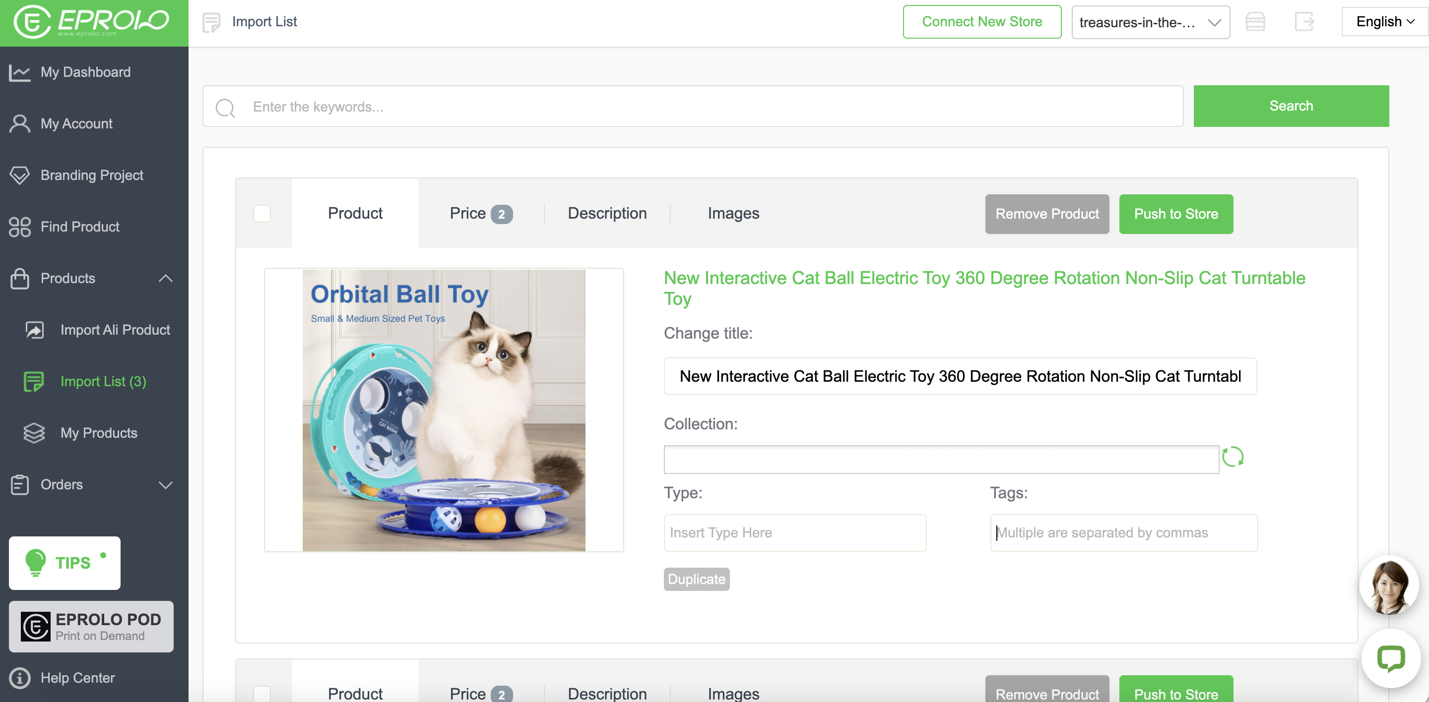 When you enter EPROLO website, go to “Products – Import All Product”, you will find a place where you can enter the AliExperess product link. After the result come out, add it to the “Import List” and then you will able to push it to your store.